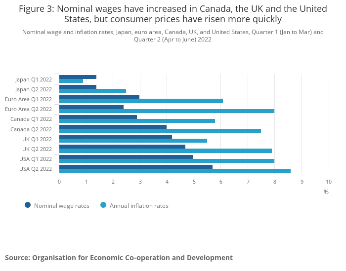 Nominal wage and inflation rates, Japan, euro area, Canada, UK, and United States, Quarter 1 (Jan to Mar) and Quarter 2 (Apr to June) 2022