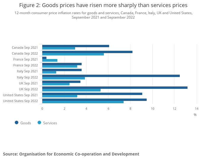 12-month consumer price inflation rates for goods and services, Canada, France, Italy, UK and United States, September 2021 and September 2022