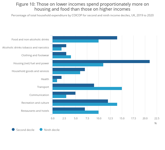 From these comparisons it seems likely that those on lower incomes are more exposed to price changes in non-discretionary spending than those on higher incomes. This is because they spend almost double the proportion of their expenditure on housing and household services than those in the ninth income. This analysis also does not account for the proportion of incomes that are unspent, as it is based on the proportion of expenditure in each income decile. The impact of the coronavirus pandemic will also have affected the levels of expenditure in all households.