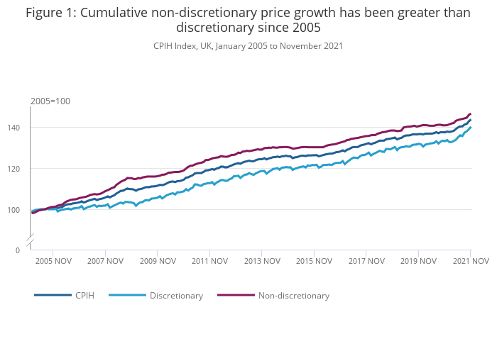 Since January 2005, prices for non-discretionary items have risen by around 49%, while prices for discretionary items have risen by around 41%.