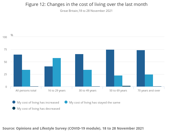 Overall, 65% of those surveyed said that their cost of living had increased in the previous month, with only 16- to 29-year-olds reporting in the majority that their cost of living had stayed the same.