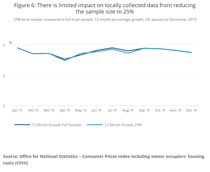 Figures 5 and 6 show the results of this exercise compared with the aggregated full sample of locally collected price data used to calculate CPIH over the period. The largest difference for the 50% sample was 0.13 percentage points on the annual growth rate in April but with other impacts 0.05 or less, and for the 25% sample it was 0.15 percentage points in August with other impacts 0.10 or less.