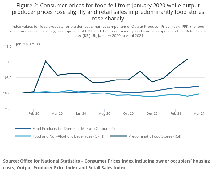 Figure 2: Consumer prices for food fell from January 2020 while output producer prices rose slightly and retail sales in predominantly food stores rose sharply