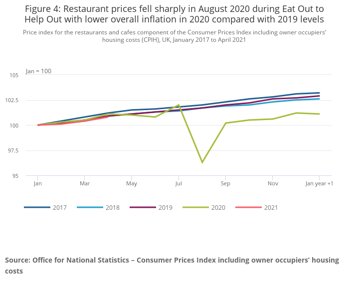 Prices fell sharply in August 2020 as the government introduced the Eat Out to Help Out scheme, offering a 50% discount on meals eaten in a restaurant on Monday to Thursday, up to the value of £10. The scheme was widely adopted by restaurants and helped to encourage diners to eat out again, running from 3 August to 31 August 2020.