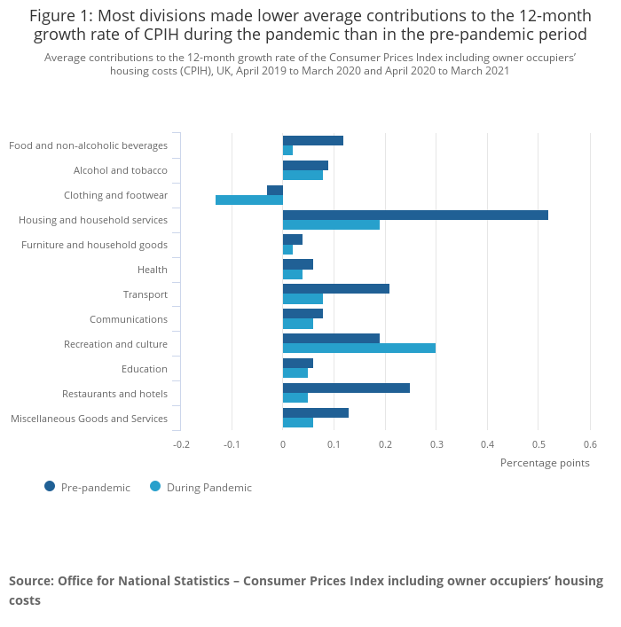 Consumer price inflation as measured by the growth of the Consumer Prices Index including owner occupiers’ housing costs (CPIH) fell sharply as the coronavirus (COVID-19) pandemic started to take hold in the UK in spring 2020 and have remained relatively low since. The 12-month growth rate of CPIH remained below 1.2% each month from April 2020 to March 2021, with a range of divisions contributing to the low rate.