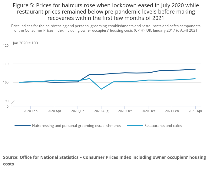 Figure 5: Prices for haircuts rose when lockdown eased in July 2020 while restaurant prices remained below pre-pandemic levels before making recoveries within the first few months of 2021