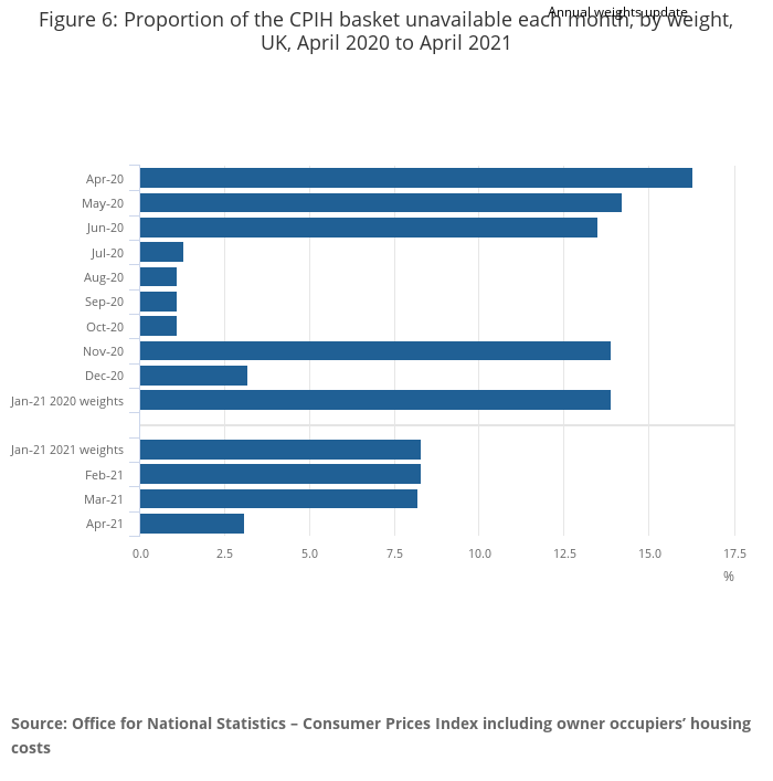 - The 12-month growth rate of Consumer Prices Index including owner occupiers’ housing costs (CPIH) rose sharply to 1.6% in April 2021, the first month in which prices are being compared between two periods of the coronavirus (COVID-19) pandemic.