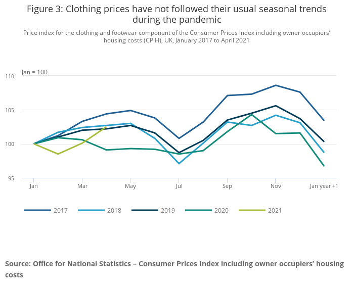 Figure 3: Clothing prices have not followed their usual seasonal trends during the pandemic