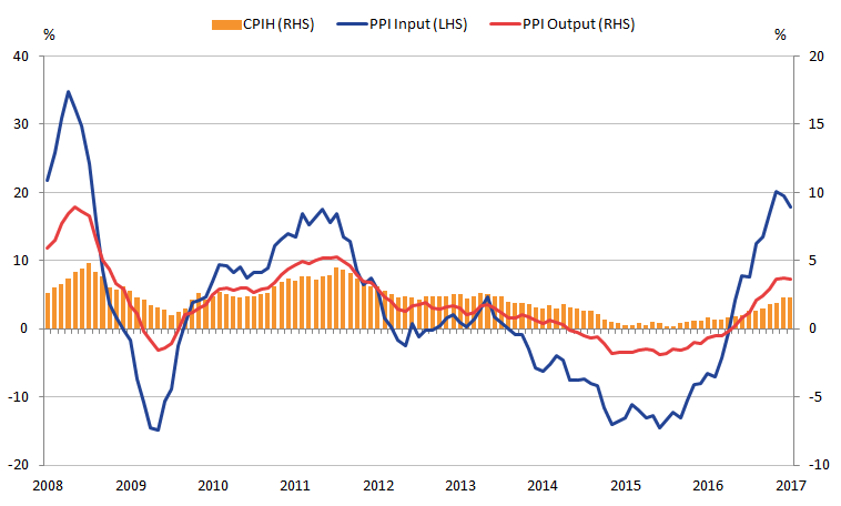 - The 12-month growth rate of consumer price inflation and output prices for manufacturers in March 2017 are broadly unchanged from February, continuing the recent upward trend in headline rates.