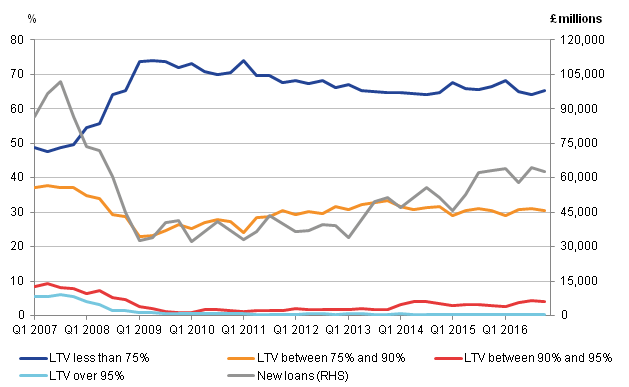 Download this image Figure 6: Percentage of new residential loans to borrowers with set LTV ratios (%, LHS) and the total amount of new residential loans to borrowers (£ million, RHS)