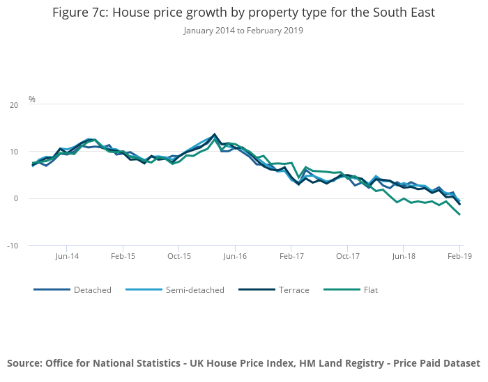 Figure 7a: In London and the South East all property types had negative annual house price growth in February 2019