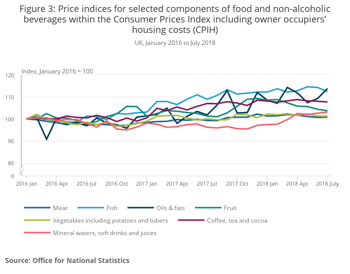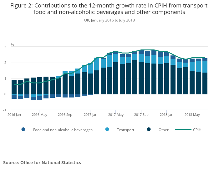 Over the last two and a half years, two of the biggest contributors to the headline 12-month growth rate of the Consumer Prices Index including owner occupiers’ housing costs (CPIH) have been transport, and food and non-alcoholic beverages. Between them, the two components have had contributions to headline CPIH between negative 0.37 percentage points in April 2016 and positive 0.90 percentage points in July 2018. Both components have put upward pressure on CPIH growth since February 2017.