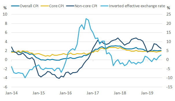 Download this image Figure 4: Non-core CPI follows trends in the exchange rate more closely than core CPI