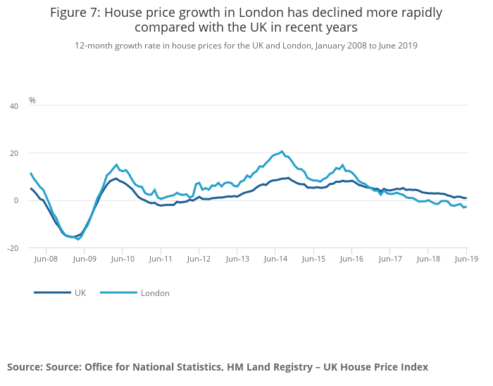 - The 12-month growth rate of house prices in London was negative for the 16th consecutive month in June 2019