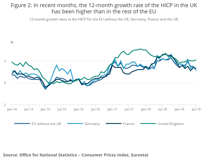 Figure 2 shows the Harmonised Index of Consumer Prices (HICP) for the European Union without the UK, Germany, France and the UK between January 2014 and July 2019. The HICP allows for international comparisons to be made on a consistent basis and is equivalent to the UK’s Consumer Prices Index (CPI) measure, as such it does not include owner occupiers’ housing costs.