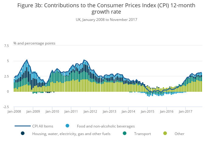 The Consumer Prices Index (CPI) 12-month growth rate edged up slightly to 3.1% in November 2017. This is significant as it means that the Governor of the Bank of England is required to write a letter to the Chancellor of the Exchequer to explain why the CPI is more than 1 percentage point above the inflation target, which has been set by the government.