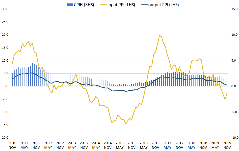 12-month growth rates for input Producer Price Index (PPI) (left-hand side), output PPI (left-hand side), and Consumer Prices Index including owner occupiers' housing costs (CPIH) (right-hand side) UK, November 2010 to November 2019, %