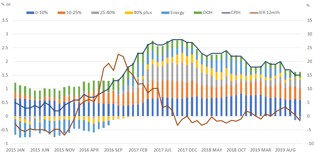 Over the last two years, the 12-month growth rate of CPIH has been gradually falling, from 2.8% in November 2017, to 1.5% in November 2019. This fall has been driven largely by high import intensity categories and energy, which combined have seen a fall in their contribution to CPIH from 1.29 percentage points in November 2017 to 0.20 percentage points in October 2019.