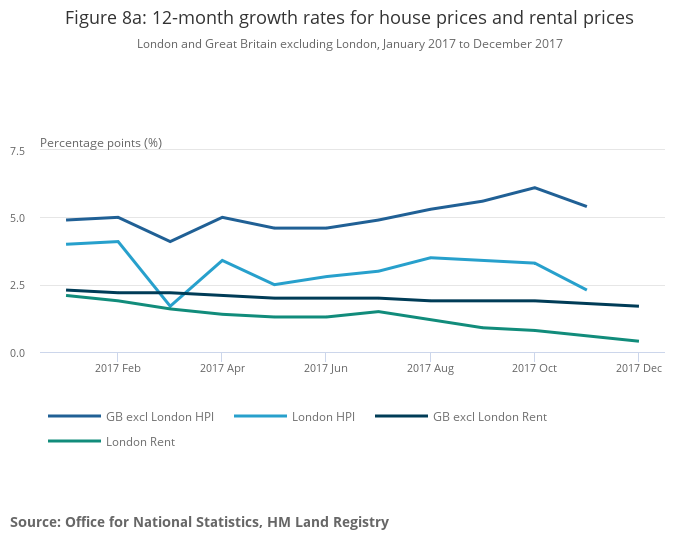 - Growth in house prices and rental prices in London was lower than those in the rest of Great Britain in 2017
