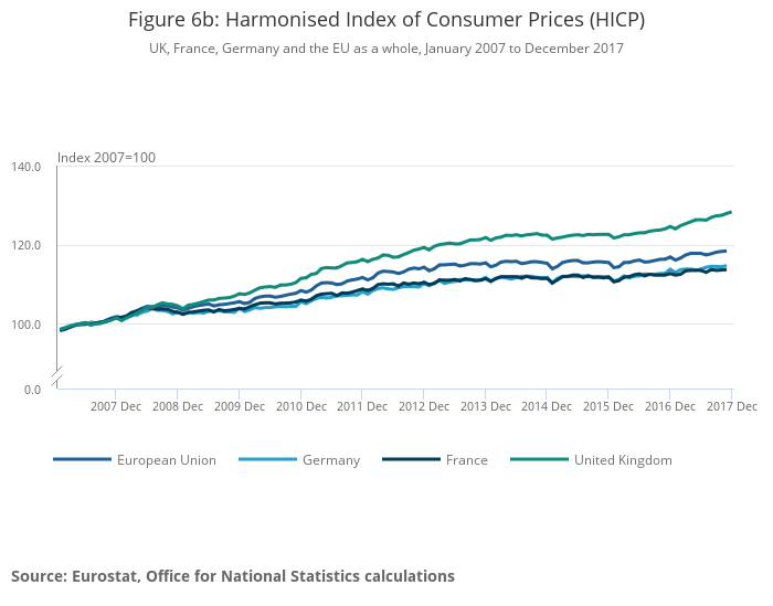 - Consumer prices in the UK are still growing more quickly than those in France, Germany and the EU as a whole in 2017.