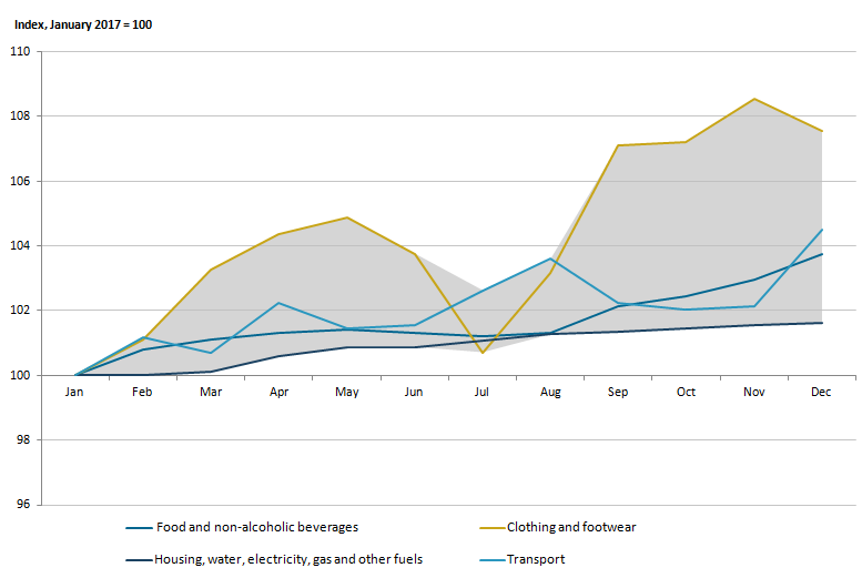 Figure 5 shows selected components of Consumer Prices Index including owner occupiers’ housing costs (CPIH) indexed to January 2017 equals 100 with the shaded area representing the difference between the highest and lowest component index for each month. All components have been trending upwards relative to January 2017 with some seasonal variation seen in transport, clothing and footwear.