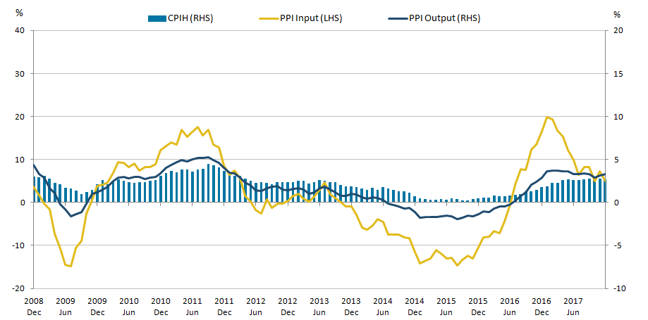 Download this image Figure 1: Annual growth rate for Producer Price Index (PPI) input (left-hand side), PPI output and Consumer Prices Index including owner occupiers' housing costs (CPIH) (right-hand side)