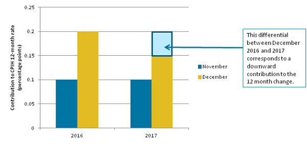 Between November and December 2017, the 12-month growth rate of Consumer Prices Index including owner occupiers’ housing costs (CPIH) fell from 2.8% to 2.7%. The largest downward contribution to this change in growth rate came from transport, which was driven particularly by air fares. As is usually the case in December, air fares rose sharply, with the increase being of a similar magnitude to the previous year. However, because air fares account for a smaller proportion of the inflation basket of goods and services in 2017 compared with 2016, the impact of the rise in price on the contribution of air fares to the headline rate was smaller in 2017 than in 2016. This in turn resulted in air fares making a downward contribution to the change in the rate. An example of this effect is illustrated in Figure 2.