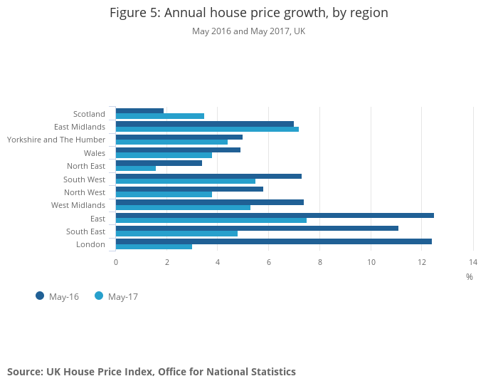 Image .csv .xlsIn the year to May 2017, the difference between the highest growing region (East of England) and the lowest growing region (North East) is 5.9 percentage points. This regional gap is below the long run average of 9.6 percentage points (January 2005 to May 2017). The last time that the difference in the annual growth rate between the highest and lowest regions was lower than 5.9 percentage points was in March 2012.