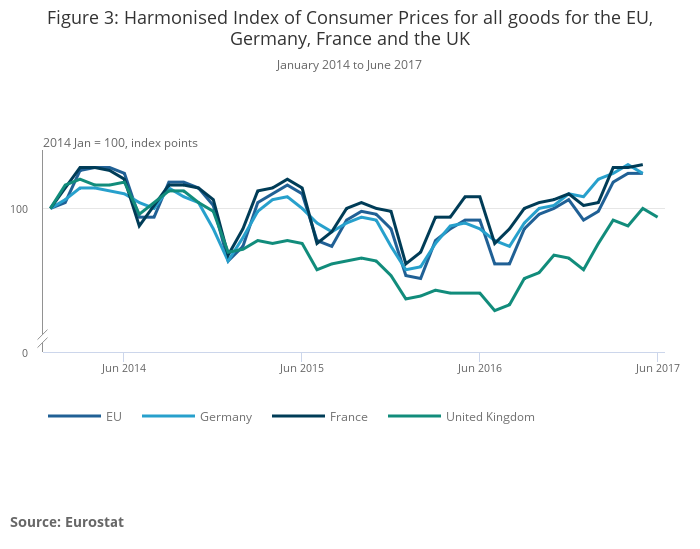 Figure 3 shows the aggregate goods component of the Harmonised Index of Consumer Prices (HICP) for the UK, Germany, France and the whole EU, indexed to January 2014. The HICP is equivalent to the Consumer Prices Index (CPI) in the UK and allows for international comparisons to be made on a consistent basis.