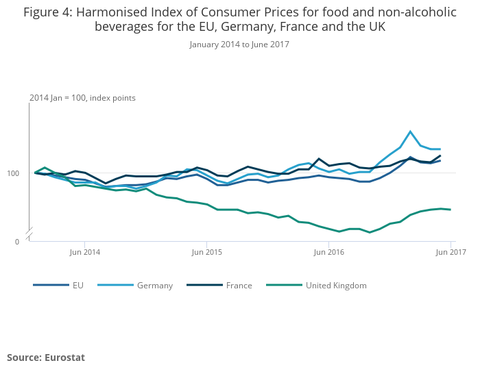 - Consumer prices for goods, including food, have been on an upward trend since mid-2016 in the UK and the EU as a whole.