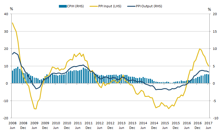 - The Consumer Prices Index including owner occupiers’ housing costs (CPIH) fell slightly to 2.6% in the 12 months to June 2017, while the growth rate of the price of goods leaving the factory gate also fell, to 3.3%.