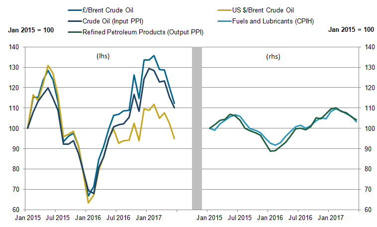 As seen in Figure 2, the brent crude oil prices in pounds sterling and US dollars tracked each other closely between January and December 2015 but started to diverge at the beginning of 2016. This gap widened further from June 2016 as pounds sterling depreciated following the EU referendum. This gap has remained although the stabilisation and slight appreciation of pounds sterling since the beginning of 2017 has meant that the pounds sterling and dollar prices have followed more similar trends in recent months. Recent falls in the crude oil component of input PPI are reflective of falls in world prices for brent crude oil in both pounds sterling and US dollars.