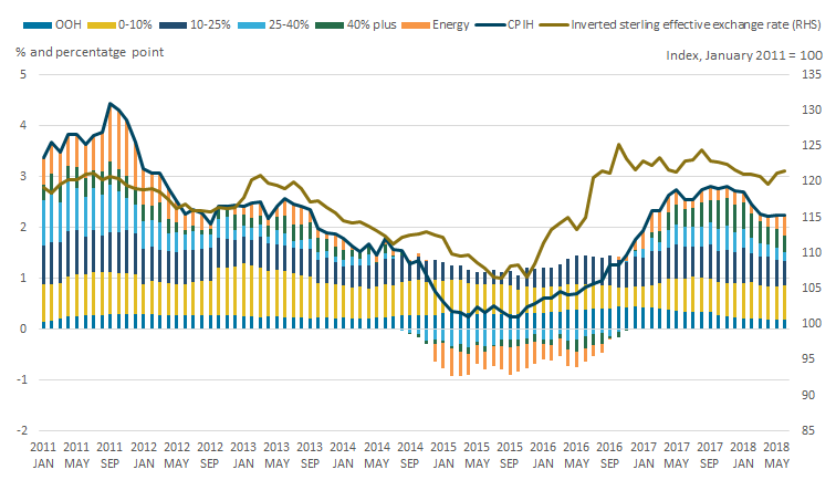 Figure 2 shows the contributions made to the 12-month growth rate of the Consumer Prices Index including owner occupiers’ housing costs (CPIH) by import intensity categories, as well as separate categories for energy and owner occupiers’ housing cost (OOH). The sterling effective exchange rate series is shown on the right-hand axis and has been inverted, meaning that a fall in the value of sterling is represented by a rise on the chart. This is for comparison with the CPIH growth rate as a fall in the value of sterling would, all else being equal, increase the cost of imported goods and services. This import intensity analysis is based on methodology from the January 2018 Economic Review.