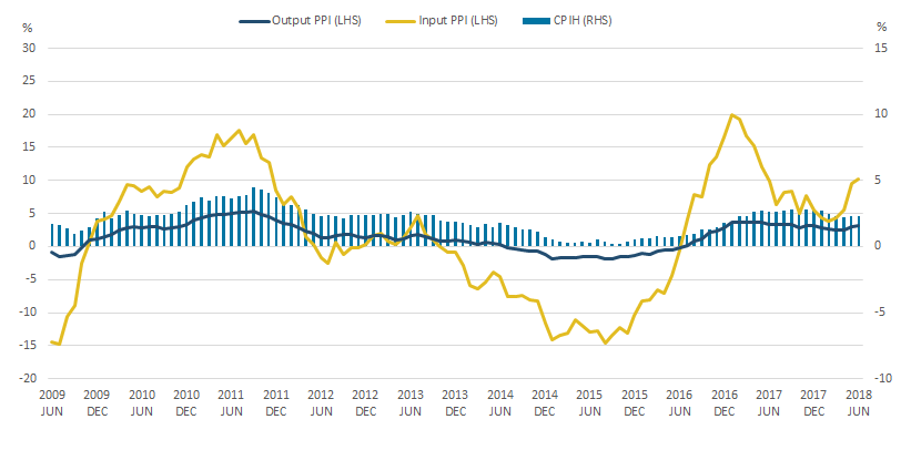 Download this image Figure 1: 12-month growth rates for input Producer Price Index (PPI) and output PPI (left-hand side), and Consumer Prices Index including owner occupiers' housing costs (CPIH) (right-hand side)