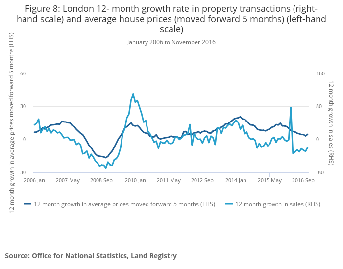 Figure 8: London 12- month growth rate in property transactions (right-hand scale) and average house prices (moved forward 5 months) (left-hand scale)