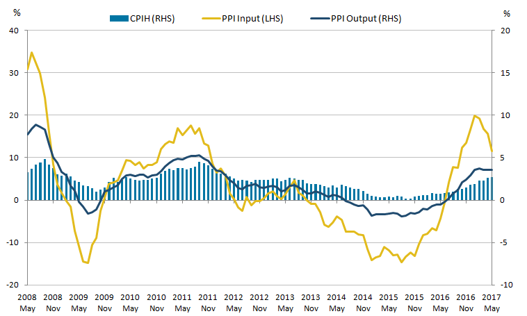 - Consumer price inflation including owner occupiers’ housing costs (CPIH) rose to 2.7% in the 12 months to May 2017 while growth in the prices of goods leaving the factory gate has remained relatively flat since January 2017.