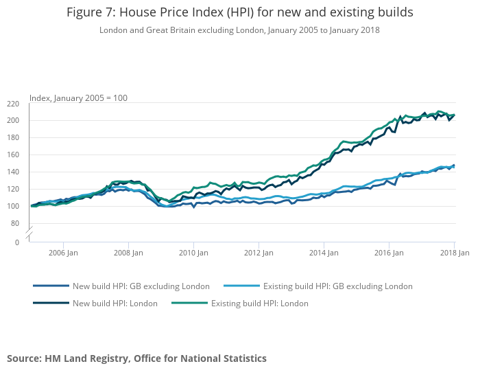 London house price growth has since stalled, with latest available data showing that the annual growth in HPI for London was negative for the second consecutive month in March 2018 at negative 0.7% while the annual growth in HPI for Great Britain excluding London remained positive at 4.6%. There remains a considerable difference in house prices between London and the rest of Great Britain however; in March 2018 the average house price in London was £472,000, more than double the average house price in Great Britain excluding London of £218,000.