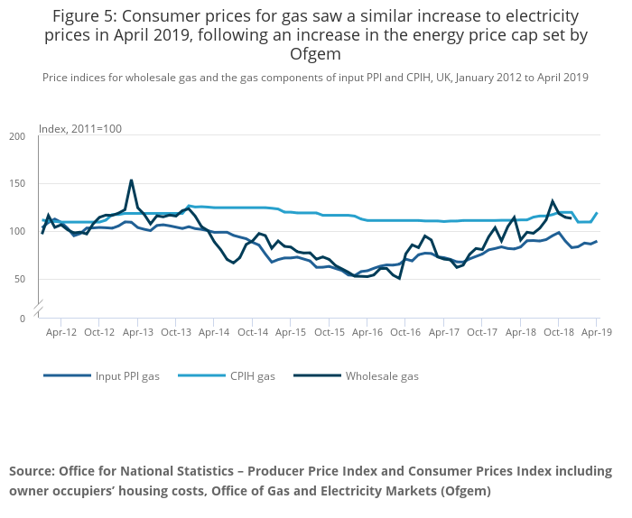 Figure 5: Consumer prices for gas saw a similar increase to electricity prices in April 2019, following an increase in the energy price cap set by Ofgem