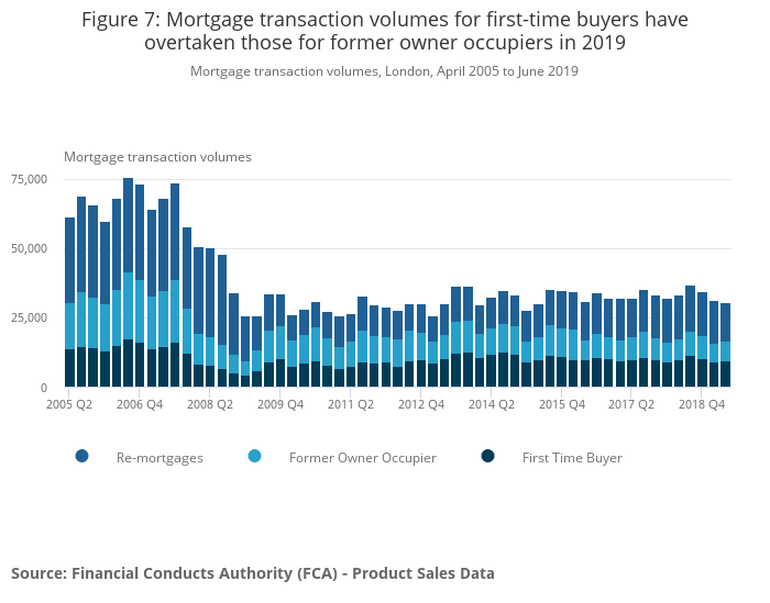 Download this image Figure 6: Mortgage transaction volumes for first-time buyers have overtaken those for former owner occupiers in 2019