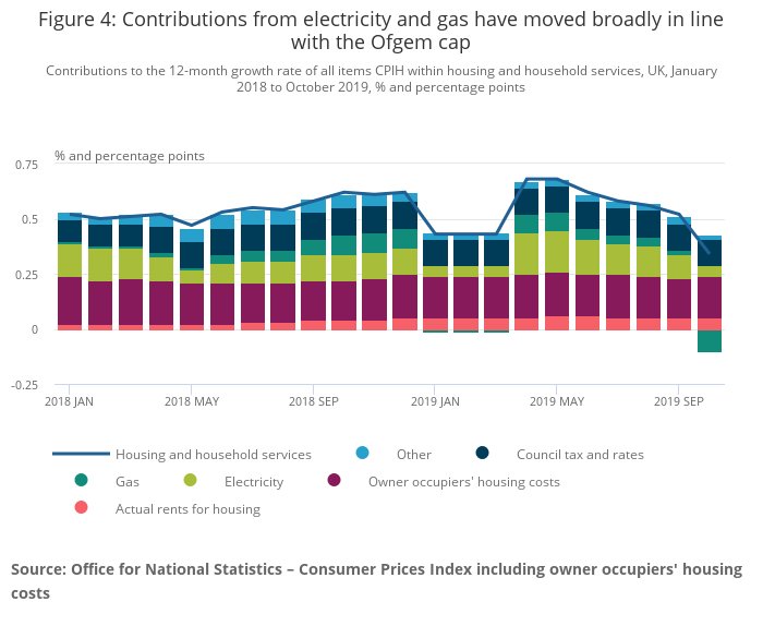 Gas and electricity continue to be among the largest drivers of movement in the overall contribution of housing and household services in 2019. Since January 2019, price movements for gas and electricity have reflected changes to the Ofgem energy price cap.