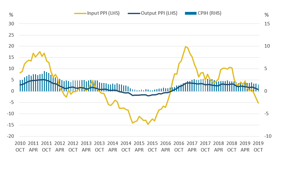Download this image Figure 1: The 12-month growth rates of CPIH, input PPI and output PPI all fell between September 2019 and October 2019