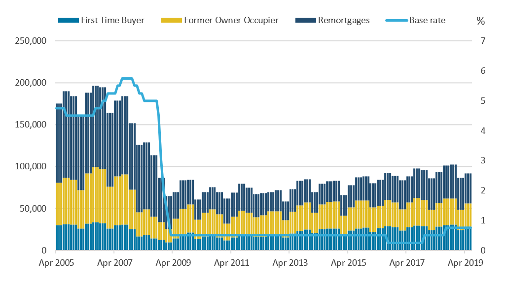 Mortgage transaction volumes (LHS) and Bank of England base rate (RHS), UK, April 2005 to June 2019