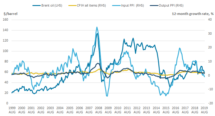 CPIH all items, input PPI, output PPI 12-month growth rates (right-hand side) and Brent oil price (left-hand side), August 1999 to August 2019