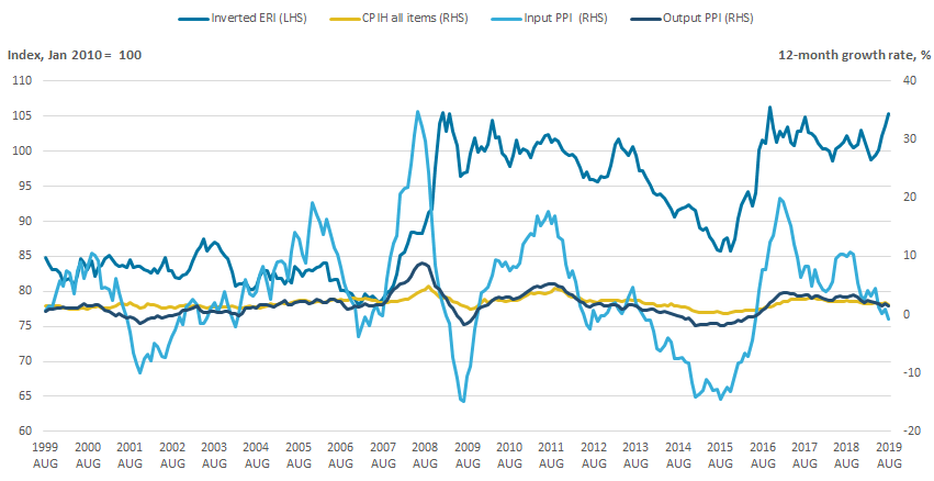 CPIH all items, input PPI, output PPI 12-month growth rates (right-hand side) and inverted sterling effective exchange rate index (left-hand side), August 1999 to August 2019