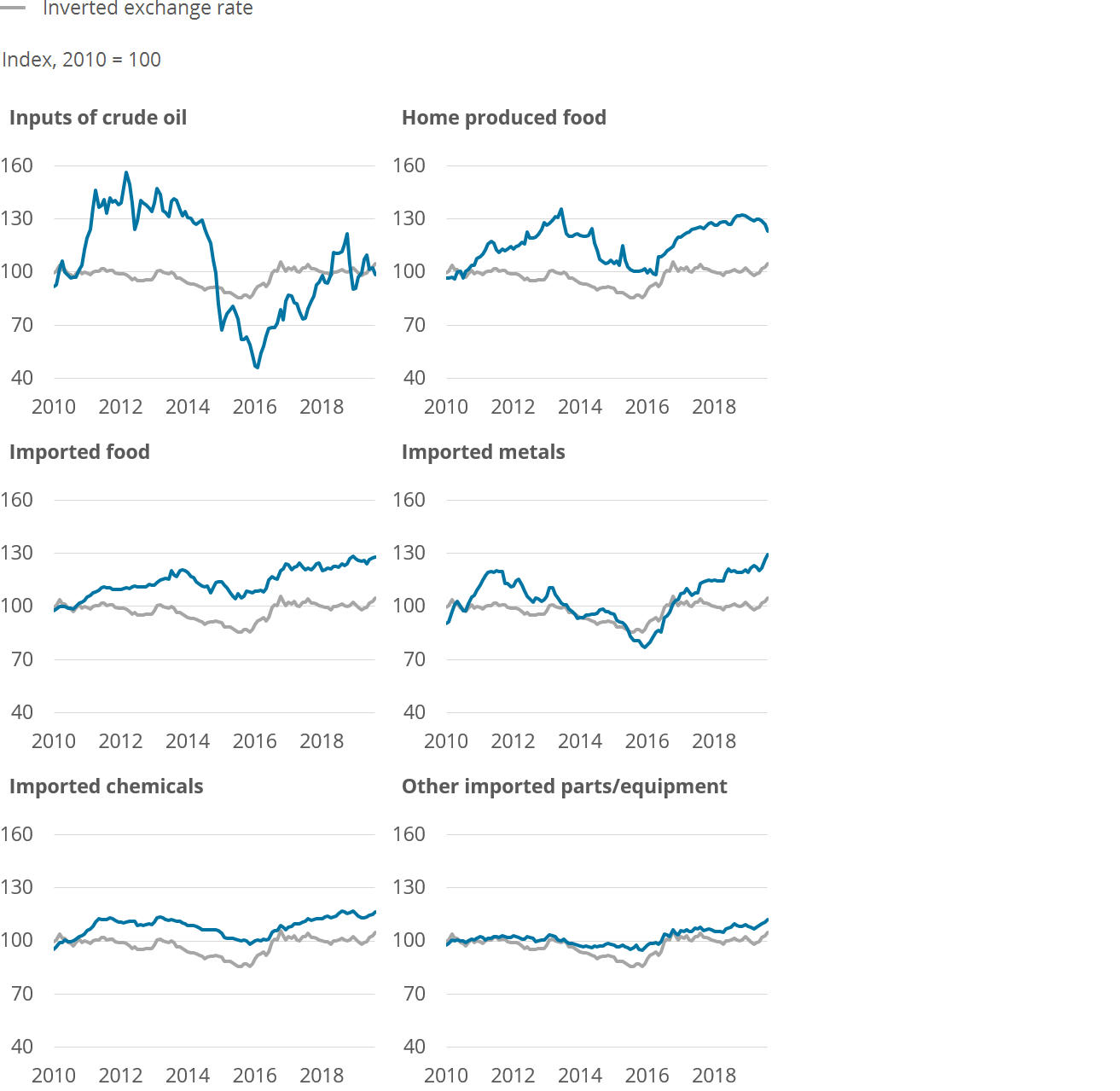 While exchange rate movements affect the input price of crude oil to some extent, the price is driven largely by the market price. The exchange rate passthrough is more visible for other imported parts or equipment, and for imported metals and imported chemicals, although with some lag. The extent of the exchange rate passthrough is smaller for imported food.