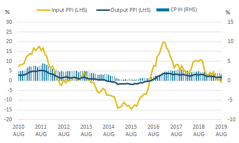 12-month growth rates for input Producer Price Index (PPI) (left-hand side), output PPI (left-hand side), and CPIH (right-hand side), UK, August 2010 to August 2019
