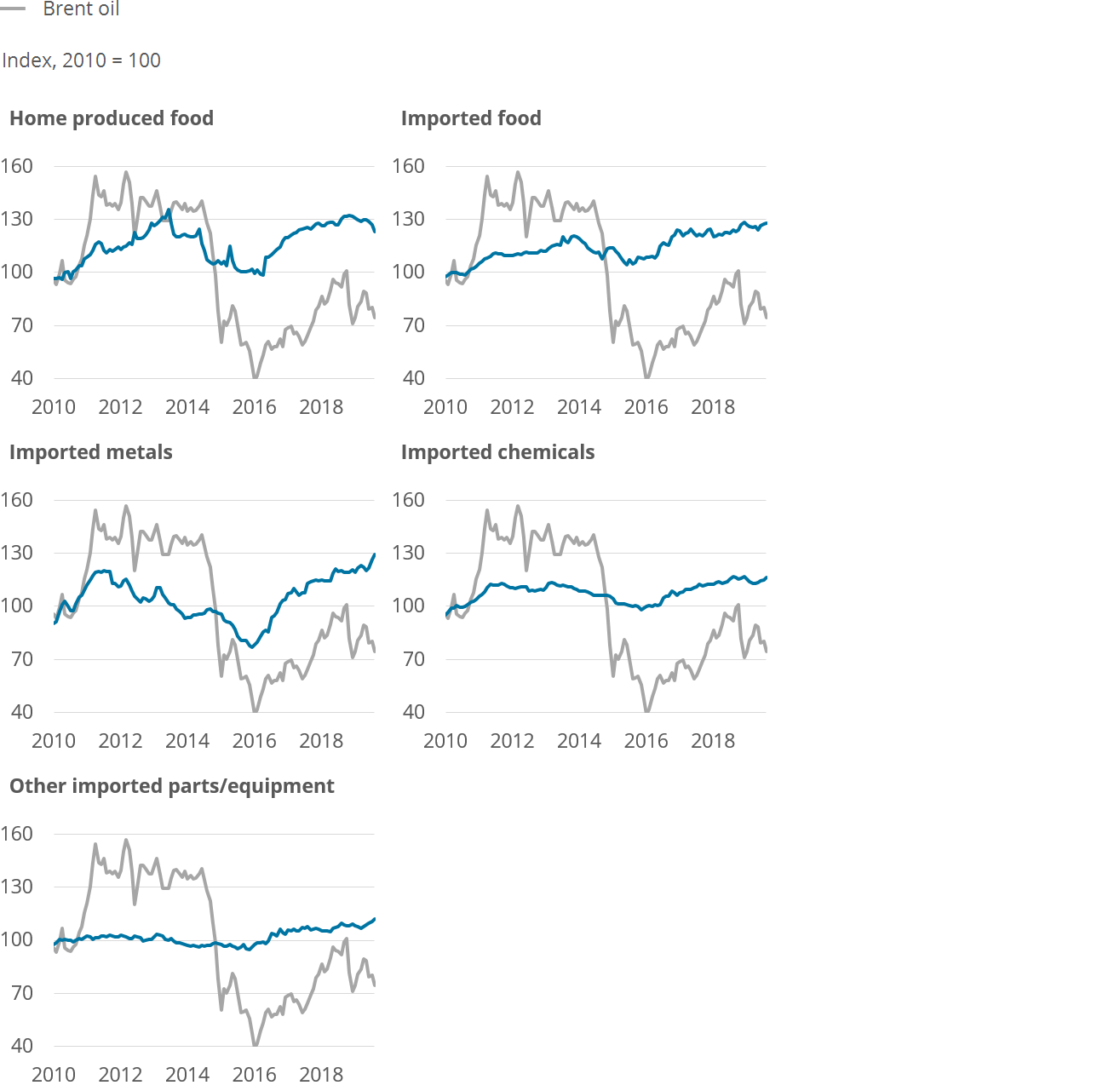 .png (33.5 kB) .xlsx (25.8 kB)Figure 6 shows the Brent price index and selected classes of the input Producer Price Index. It shows that while all classes showed movement with changes in the price of Brent oil, certain classes of producer prices moved more than others between January 2010 and August 2019. For example, the magnitude of passthrough to imported metals was larger than that of other imported parts or equipment.
