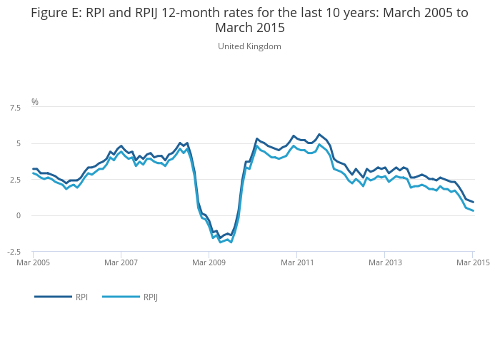 Download this chart Figure E: RPI and RPIJ 12-month rates for the last 10 years: March 2005 to March 2015