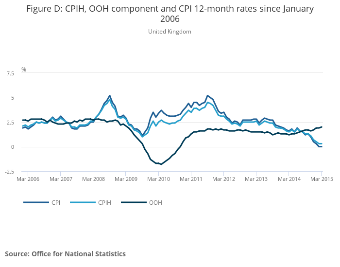 In March 2015, the 12-month rate (the rate at which prices increased between March 2014 and March 2015) for CPIH stood at 0.3%, unchanged from February. The difference between the CPI and CPIH annual rates in March 2015 was 0.3 percentage points, the same as the difference in February, despite a small upward contribution from rising owner occupiers’ housing costs.