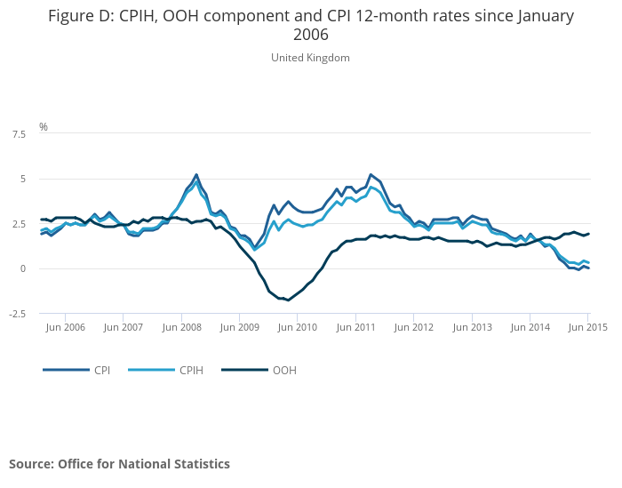 In June 2015, the 12-month rate (the rate at which prices increased between June 2014 and June 2015) for CPIH stood at 0.3%, down from 0.4% in May 2015. The difference between the CPI and CPIH annual rates in June 2015 was 0.3 percentage points, the same as the difference in May, despite a small upward contribution from owner occupiers’ housing costs.